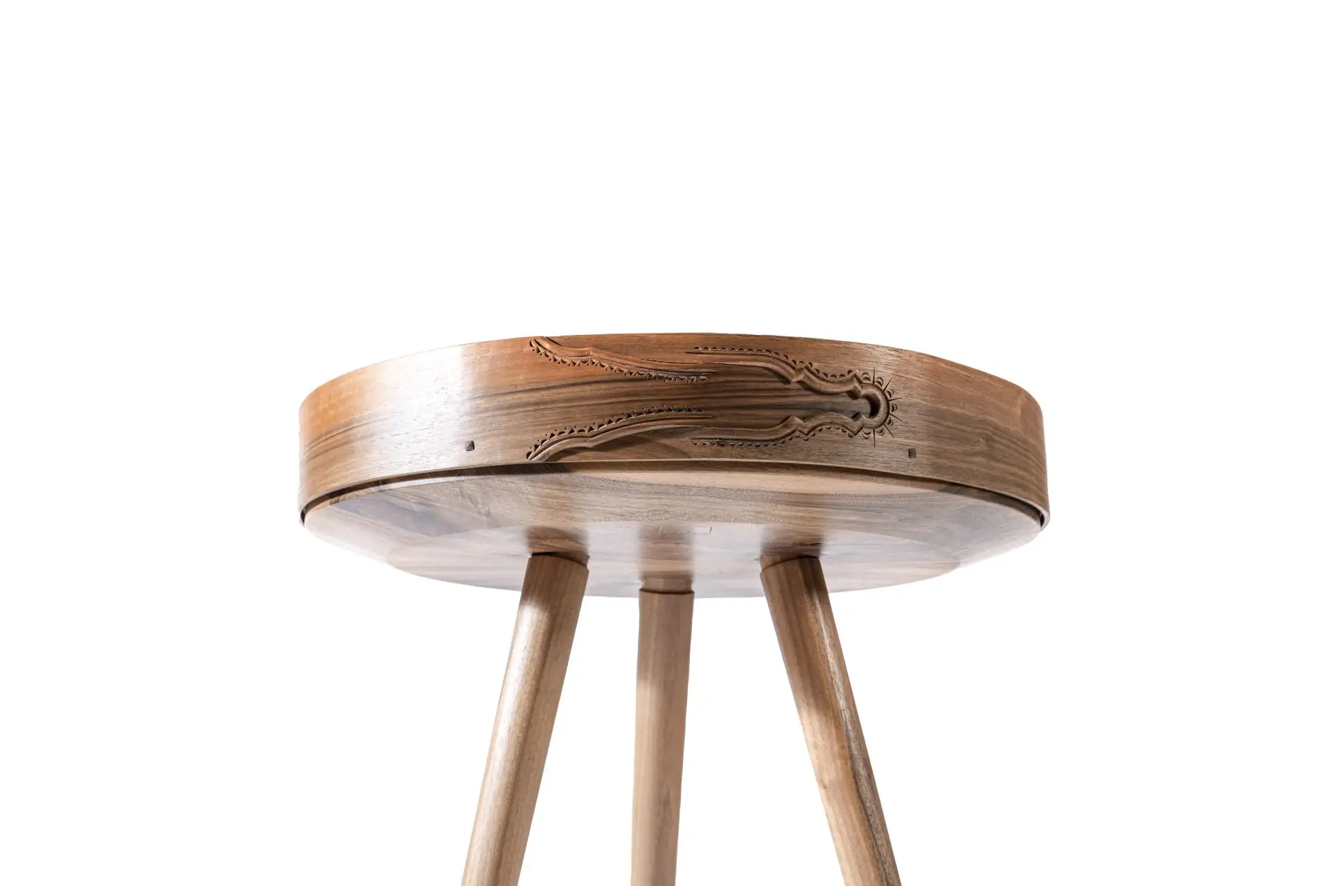 Das verwendete Holz Esche wird geflammt oder umgangssprachlich «verbrannt» und schwarz gebeizt – daraus entsteht die Bezeichnung «carbonia». Der umlaufende Reif von Hanni wird im Wasserbad erhitzt und danach in die entsprechende Form gebogen. Die Verzierungen werden von Hand geschnitzt und den speziellen Verschluss des Reifs fräsen wir auf unserer CNC-Maschine der neuesten Generation. Kunsthandwerk gepaart mit modernsterer Technologie resultiert in einem wahren Schmuckstück, nicht?